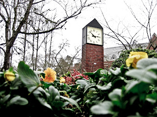There are a few things that I think could have been altered in order to make the photo composition stronger. I would have actually liked if the focus of the photo was on the flowers rather than the clock itself. It is completely a personal preference, taking to the plants more than to the brick clock that I see everyday. It would have shown how much focus isn't put on something that is also always in our path. I feel like if the clock and background were blurred we'd still be able to know where the photo was taken, and a bit of mystery would have been added to the image, not knowing the time and possibly not having the library roof so apparent. Which brings me to my next point, that even if it may have been impossible to get the library roof out of the shot, I feel like a photo without it present would have been better because it takes away from the subject.